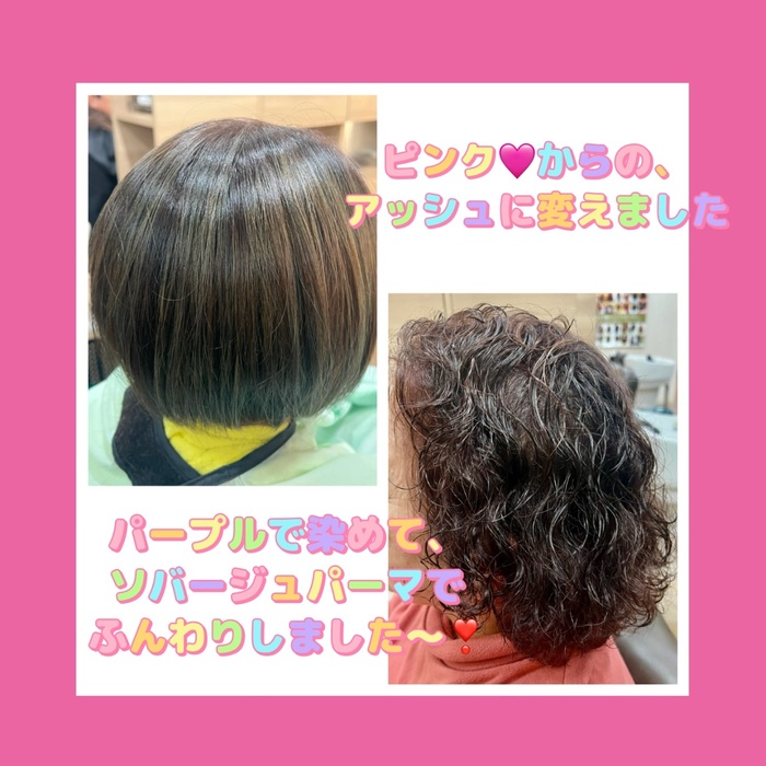 それぞれの、好きなお色でカラーチェンジしてます。そして、ボリュームを出すためのソバージュパーマにしました。